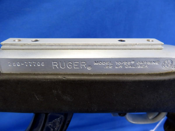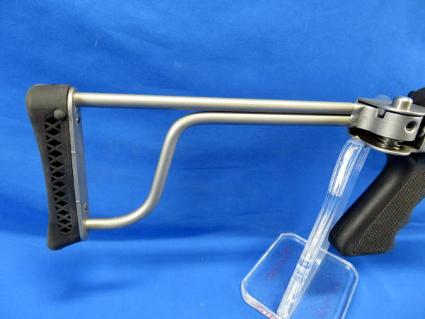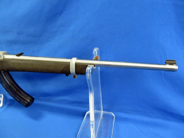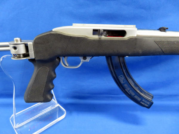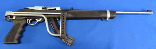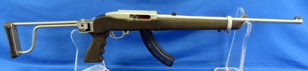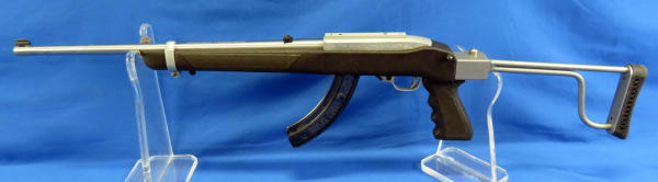 18.5" Stainless barrel; black synthetic stock; folding wire shoulder stock; has regular magazine & banana clip; pistol grip; made in USA; SN#250-77706