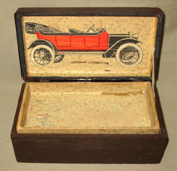 Neat piece, box has the original tray, measures 10" long, 5" deep, 4" tall, has normal wear, outside might have been repainted, the Luverne Automobile was produced on a very small run