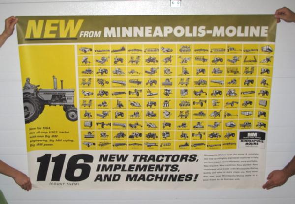 Another super poster, large tractor is a U-302, but shows 116 different pieces of equipment includes U602 diesel High crop, 108 Lawn & Garden, combines, G-706, U302, and so much more, minor wear to the edges, but overall is another exceptional piece, large, measures 42"x58"