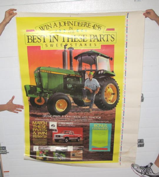 43.5" wide with a wide right margin, has some wear from use, but overall in nice shape, nice graphics of a popular JD tractor