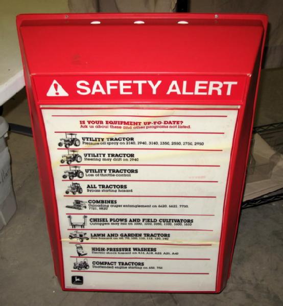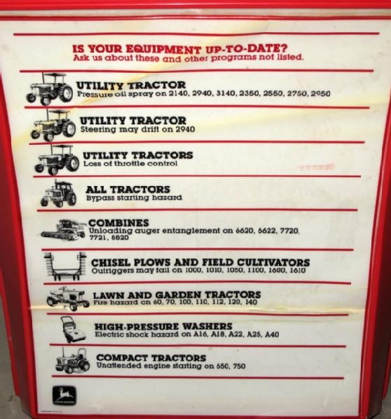 Unique sign, shows what can go wrong with your JD equipment, insert has some damage, but case is nice, about 3'x2'; Hard to find, not many dealers displayed or kept them because is showed the problems with the JD equipment