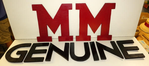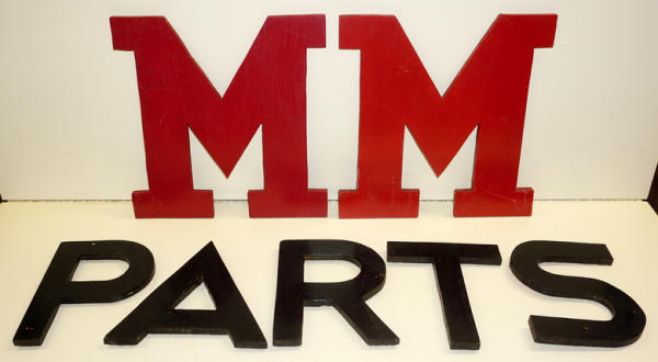 "MM" is 14" tall, black letters are 9" tall, all cut from plywood, old original pieces, might have been repainted at one time, includes 2 sets of "MM" letters, all to go