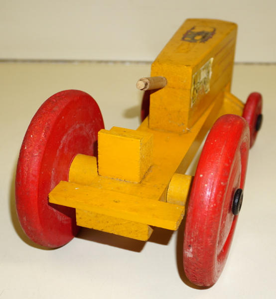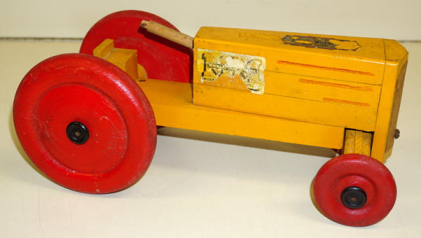 12" long, different style tractor than the previous lot, has an old dealer decal on the hood from Burlington, IA, no steering wheel, decals are about 60% condition, but paint is nice, hard to find toy produced during the war years