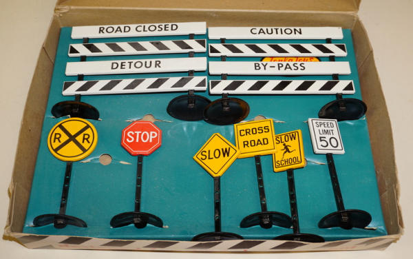 Great set, complete, signs are all mint to near mint condition, graphic box is pretty good, has a spot of white paint on eh front, but overall still nice; I think this is only the 2nd boxed set of these we have ever offered