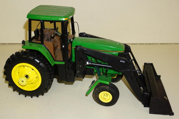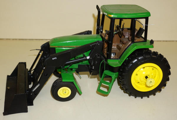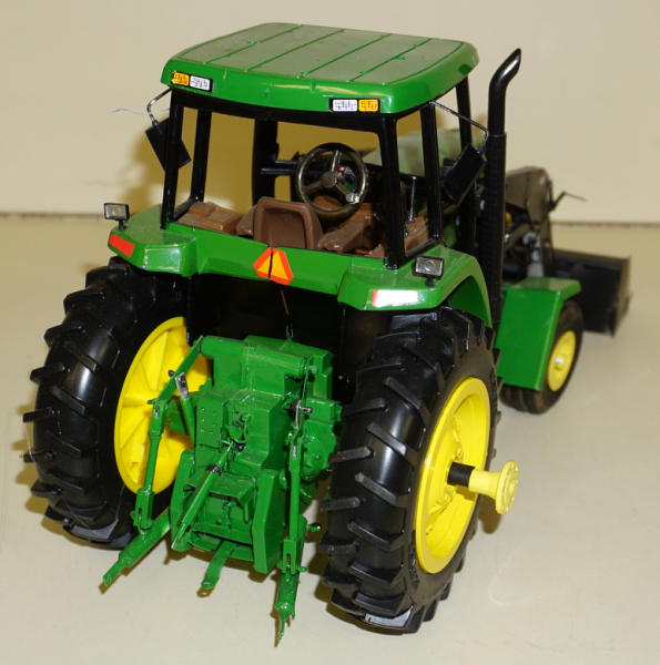Ertl Tractor that has been heavily customized with 3pt, axle hubs, lights, mirrors & more; loader is all scratch built and very detailed, lightweight, going to need a little attention to the cylinders, but still very nice; no shipping