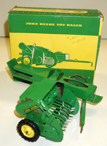 no rear hitch variation, baler is about 90% paint with some play wear, box is pretty clean and nice, has "$2.45--7-28-58" written on the front, overall rates 8.5 condition