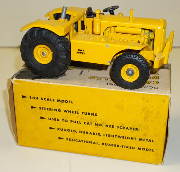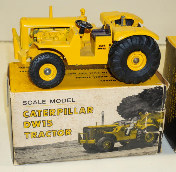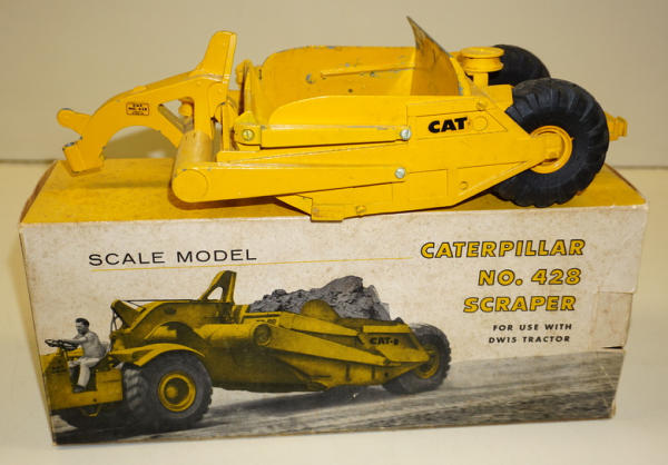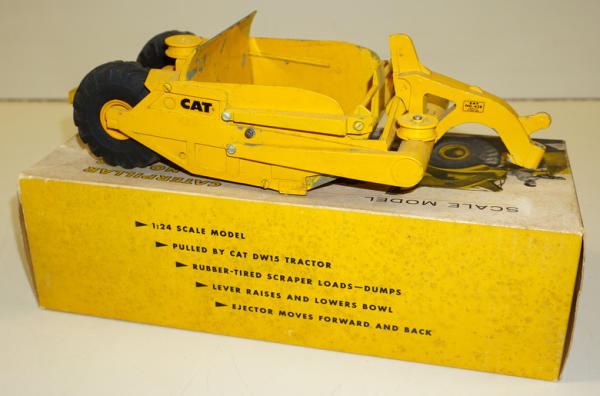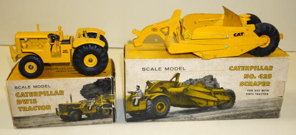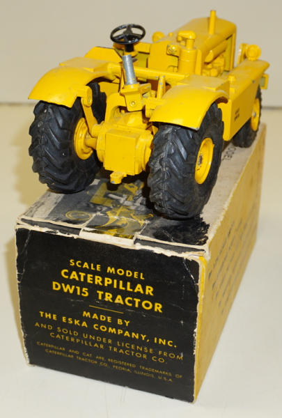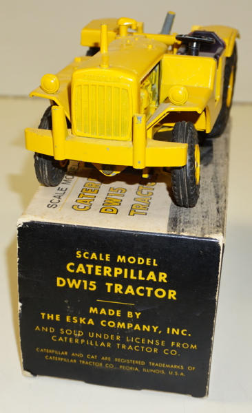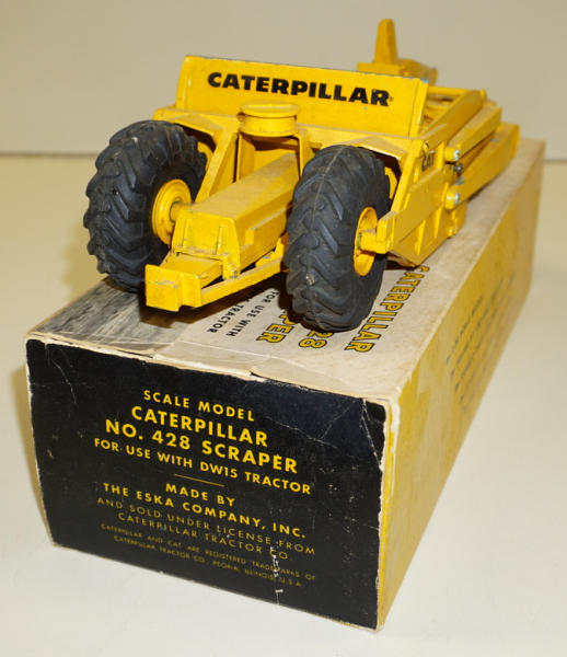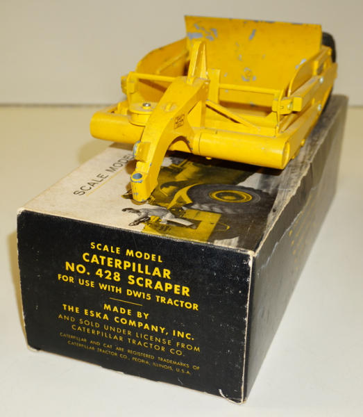 Toys are both nice, tractor is about 90% paint, scraper is closer to 85% paint; both have plastic rims; great graphic boxes, both are complete and square, marked, ESKA, but has some age spots and general wear, both boxes rate 7.5 condition, sells as a set