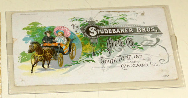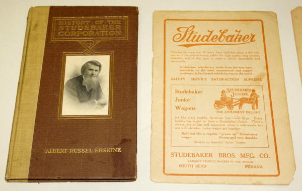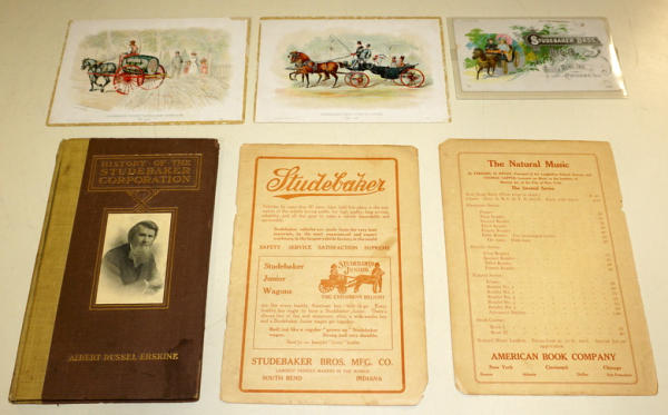 Book is 98 pages with light wear, shows buggies & automobiles, includes 3 trade cards and some other paper advertising, all has some wear, all to go