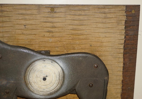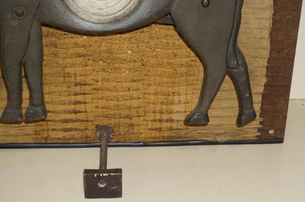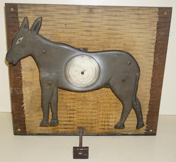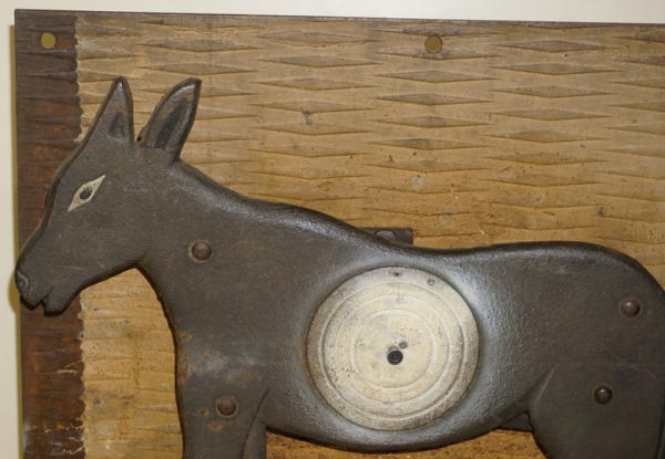 back plate is 27"x24" overall, donkey is 22" long and 18" tall, all working condition, hit the center and the leg kicks out; super heavy, probably close to 75-pounds overall; local pickup would be preferred or could be crated at the buyer's expense; fantastic piece for the collector that likes unique pieces!