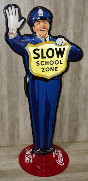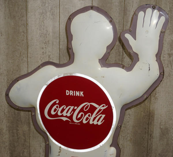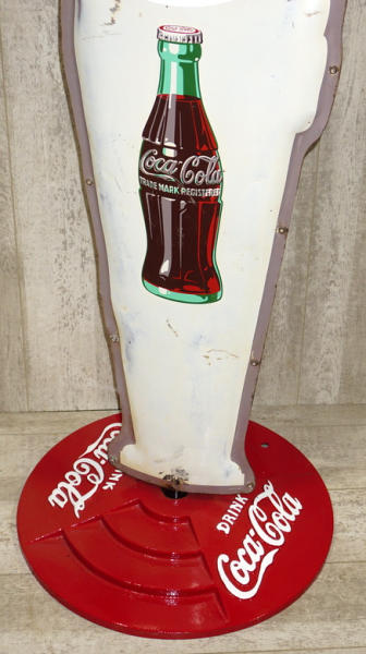 63" tall, very good original, the guard size has some general wear, but great color, one bolt in the hand has been replaced, back side with the Logo has some fading in the white; cast iron base has been nicely restored; classic sign in above average condition! No shipping, local pickup only