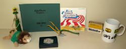 various advertising, most pieces are nice, nice collection in a showcase, lots of pieces, all to go