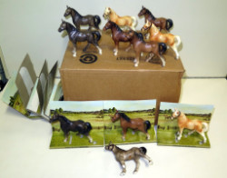 all 4" long, sell for one money, each has a cardboard stand; one horse does have broken leg