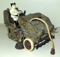 one of the neatest cast iron pieces ever produced, about 9" long, great detail, driver has been replaced, rest looks original and good condition, paint is about 65%, no mint, but a very rare and hard to find piece; UPDATES: Both sides of this toy have been welded above the side brooms, you can see the different color paint on the sides. Still displays very well