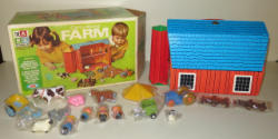 has been opened, barn has some play wear, a lot of the plastic toys have never been punched off the cards, box has some wear, large set, box is 25"x15"