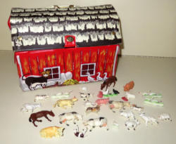barn is 10"x8", wood barn, mostly plastic animals, nice condition