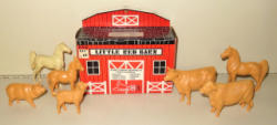 stamped on the bottom, matches the horse stable earlier in the auction, barn is 15"x12", nice original set, no box