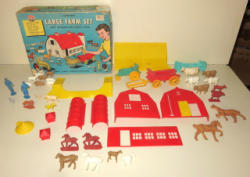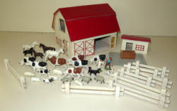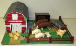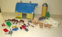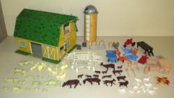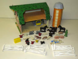 Barn with lots of accessories, machinery & animals are hard rubber, barn is wood, comes with the original box for the animals, barn is 15"x9"