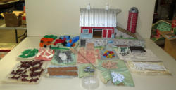 looks like 100+ Pieces, no box, nice condition, barn is 12"x9"