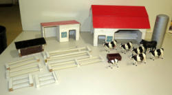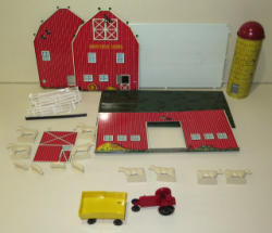 includes chicken house, 2 silos, tin tractor, wagon, implements and more, no box, barn measures 20"x9"