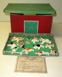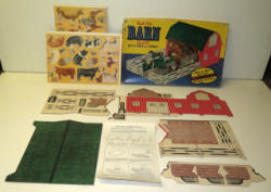 Cardboard & Wood Barn with 11 Auburn hard rubber animals, nice condition, barn measures 15"x9"