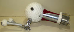very unique piece, 2-spicket tap, about 21" tall, ball is about 9" across, heavy cast aluminum, includes two golf ball tap handles, neat piece for the golf nut!