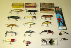 includes a pretty nice glass eye Creek Chub Pikie in the box, rest have wear, all to go