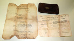 comes with an old leather wallet that the papers were found in; tells how the soldier was ordered to report for duty on the 18th but would not be able to make it on time; papers have some wear and are fragile; neat piece of history