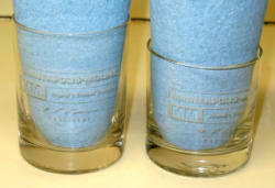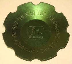 each about 5" across, one with logo has light wear, blue one is nice, 2x the money