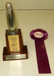 Trophy is about 10" tall, ribbon is 12", both have normal wear, 2x the money
