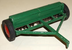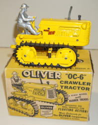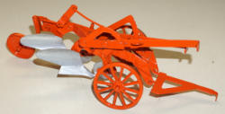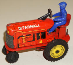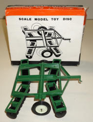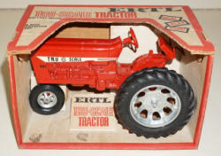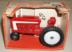 made in Hong Kong, tractor is 7" long and near mint, 2 implements are plastic, plow is metal, box is complete with some general wear, did not test