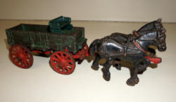 10" long, paint is about 80%, horse is cast into the cart, not sure on the maker