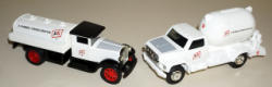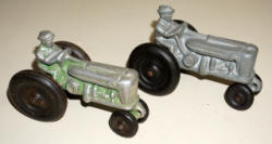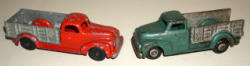 Green is cast iron, but I believe a reproduction of the other truck; each 6.5" long, both have wear, 2x the money