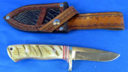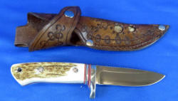 handle made of Elk Horn; Stainless Steel 154CM Rc.60 3.5" blade; leather sheath w/snake skin inlay; file work on top of blade!
