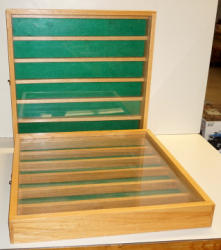 Wood with glass fronts, 6 shelves, should hold about 30 buckles each, 23"x24"; sells 2x the money; no shipping, local pickup only for online bidders; sells 2x the money