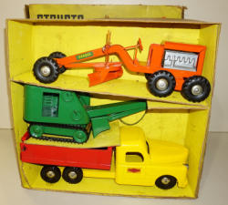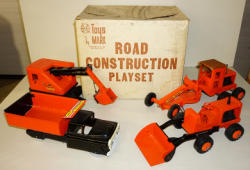 Toys are all very clean and nice, near mint originals, Road Grader still has the wax paper wrapped around the cab! Rubber tracks are split on the shovel; comes in a large box, has the smaller inserts inside, box has fairly heavy wear, overall a great looking and scarce Marx Set