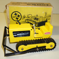 7" long, toy is 95% condition with light play wear, Tin friction w/ plastic shovel boom, 2pc box has very heavy wear, rates 6 condition