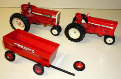 Wagon has broken wheel, tractors both have play wear, all to go for one bid