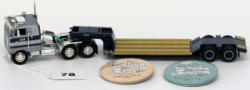 1/64 scale; DCP and Spec Cast Cat Challenger; on Lowboy Trailer; Kenworth; Button/Badge