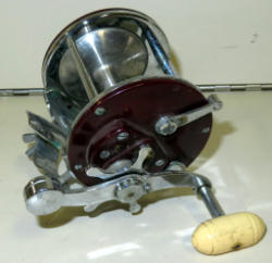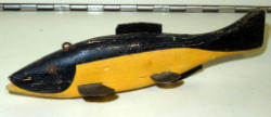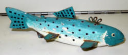 hand made of wood w/weights added to bottom; metal fins; nice look; one side is faded; 6.25" long