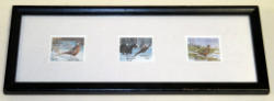 three stamps mounted and framed; includes a 71-72, 72-73 & 1975; frame is 10.75" x 6.75"