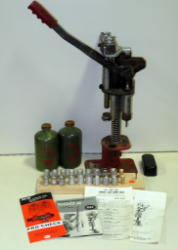 unique tool to set the primers on your brass shell casings; includes two brass casings; no marking other than a couple numbers on the bottom of the tool; never seen one before