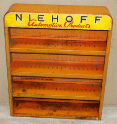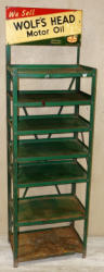 29"x42"x5", used, has rusty shelves and patina, rates 6.5 condition, great shelf for oil cans