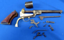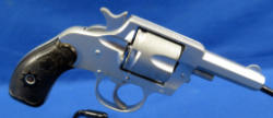 not positive on caliber; 2.5" Oct. barrel; looks like almost a painted stainless finish; cylinder wants to spin freely; has some wear; made in USA; SN#4142