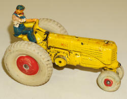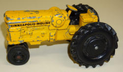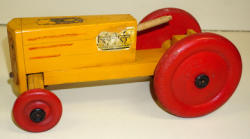 12" long, different style tractor than the previous lot, has an old dealer decal on the hood from Burlington, IA, no steering wheel, decals are about 60% condition, but paint is nice, hard to find toy produced during the war years