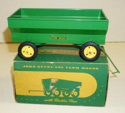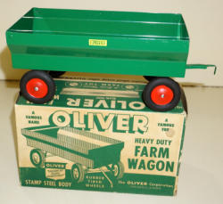 Plain green wagon, a little lighter green than Oliver green; diecast hitch; toy is mint; Box is missing all flaps on one end, but square, box rates 6.5 condition