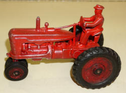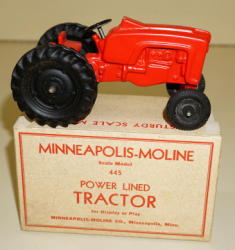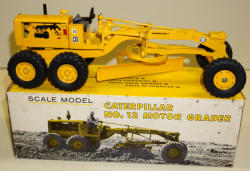 Toy is near mint original paint, someone at one time highlighted some pieces on the motor in black & red, but did a really nice job; metal rim grader; box is clean and nice, super graphics, box rates 8.5 condition
