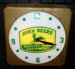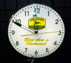 15" across, original clock and works, but has a crack running from the center through the "6", displays fine, but it's there