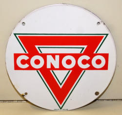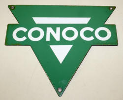 rated repainted stand, 42"T., has two SSP die cut Conoco signs one has chip, comes with 14 cans; sells as a set for one money