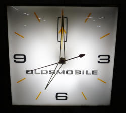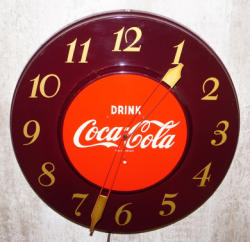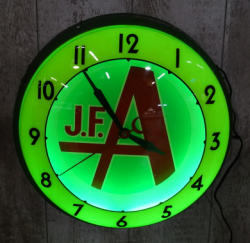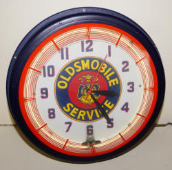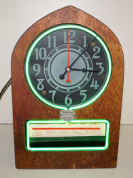 rated 8.25, 15"D., the plastic neon lighted clock, is lightly soiled, works, metal body; same style as the Oliver clock we have sold before