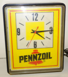 rated 9, 17"x25.5"x5", the plastic and metal clock is in very good condition, works, looks like the can was restored